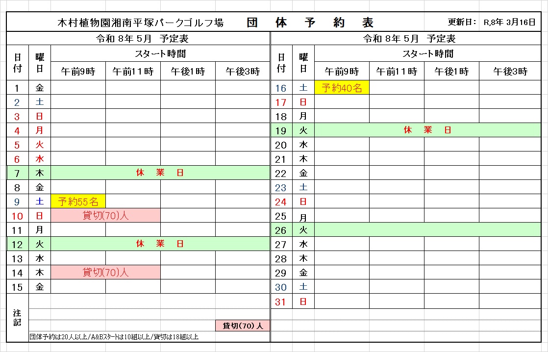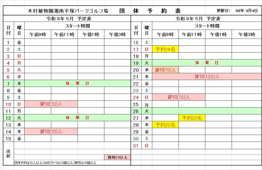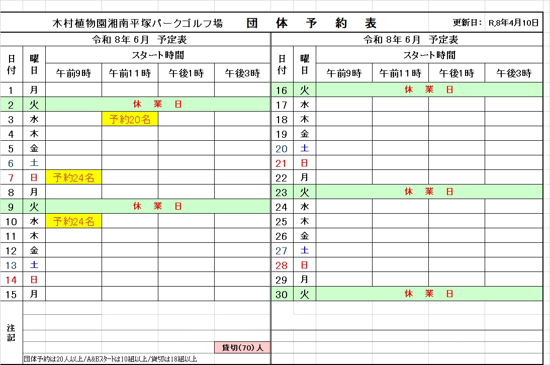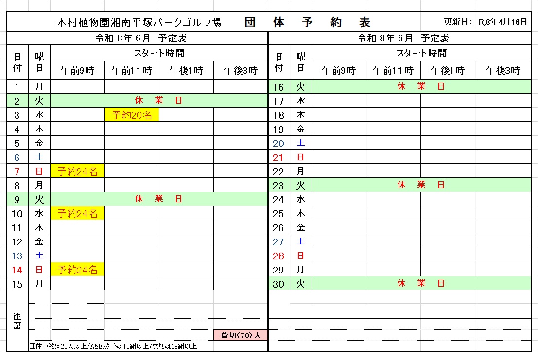 2021年4月11日 / 最終更新日 : 2026年4月16日 パークゴルフ場 スタッフ 予約状況 4月から6月の団体利用予約状況 4月~6月の団体予約状況は以下の通りです。 〇 4月団体予約 〇 5月団体予約 〇 6月団体予約 20人以上の団体は、利用希望日の2ヶ月前から10日前までに、パークゴルフ場の管理棟または平塚市のスポーツ課に申し込みください。